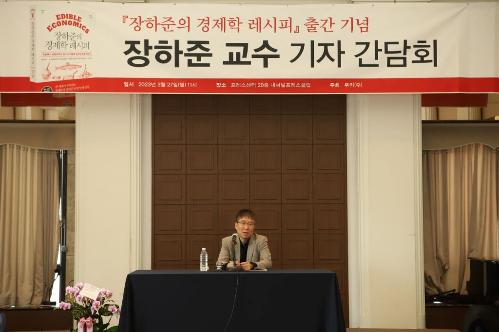 장하준 영국 런던대 교수가 27일 오전 서울 중구 프레스센터에서 열린 '장하준의 경제학 레시피' 출간 기념 기자간담회에서 발언 하고 있다. [사진제공=부키]