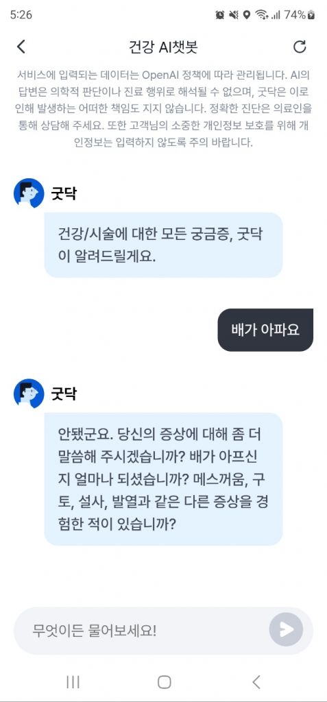 건강 AI 챗봇은 애플리케이션을 통해 간편한 건강 관련 상담을 할 수 있는 서비스다. 24시간 실시간 상담을 해준다. 질문에 따라 굿닥이 기존에 제공하던 서비스인 비대면 진료, 병원 예약, 클리닉 마켓으로 연결을 해주기도 한다. 굿닥은 자사의 개발인력을 총동원, 단 3일 만에 챗봇을 개발했다. 챗GPT 가 오픈 API 기반이었기 때문에 가능한 일이었다.