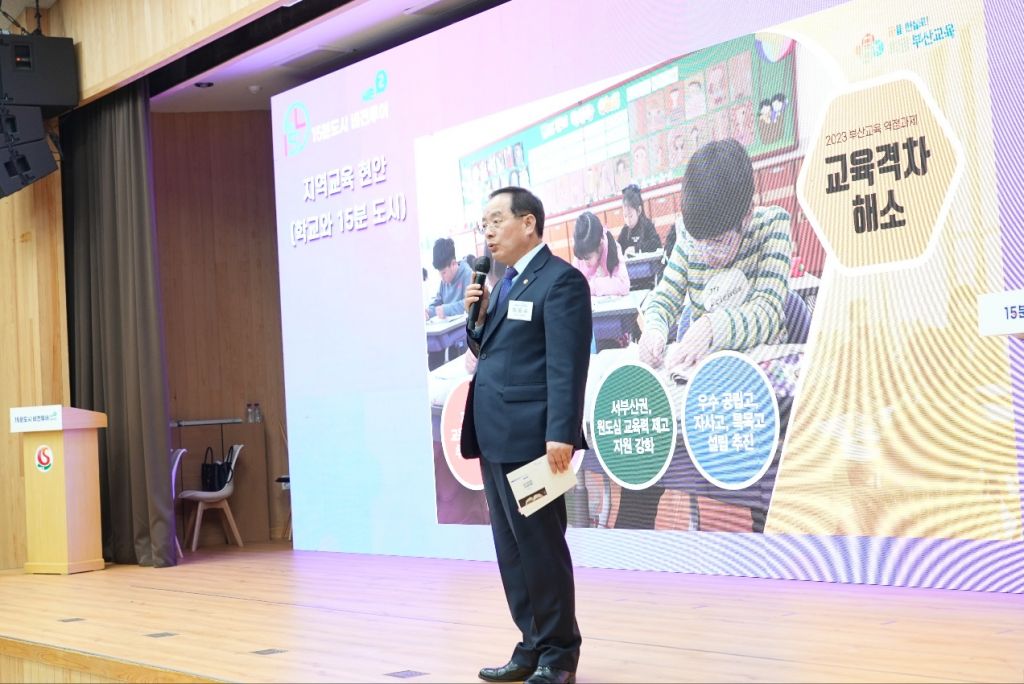 하윤수 부산시교육감이 27일 사하구청 대강당에서 열린 ‘부산시 15분도시 비전투어’ 행사에 참석해 교육정책에 대해 브리핑했다.