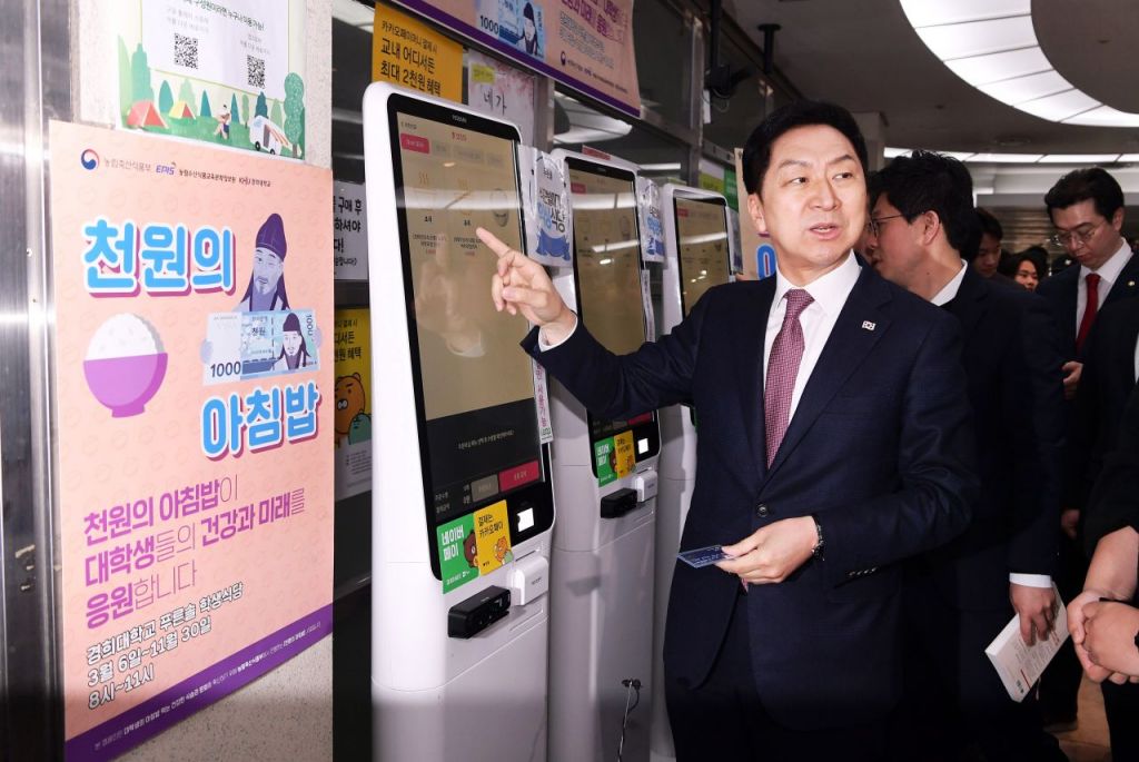 김 대표와 김병민 최고위원, 박대출 정책위의장, 국회 농림축산식품해양수산위원회 간사인 이양수 의원 등은 이날 경희대학교 총학생회 임원들과 권오병 학무부총장 등과 식사를 함께하며 청년 지원 확대 방안을 논의했다. 1000원 아침밥은 정부, 대학본부, 생활협동조합이 식비를 나눠 부담해 대학생의 부담을 덜기 위해 마련된 정책이다.