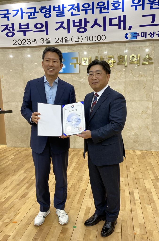 지난 3월 24일 구미상공회의소에서 열린 대한상공회의소 50주년 기념식에서 박배호 LIG넥스원 C4ISTAR 생산본부장(오른쪽)이 김장호 구미시장으로부터 국가산업 유공 산업통상자원부장관 표창을 받고 있다.