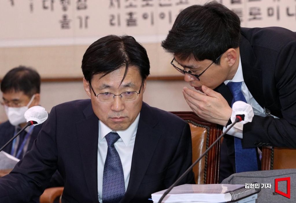 김형두 헌법재판관 후보자가 28일 서울 여의도 국회에서 열린 인사청문회에 앞서 관계자와 대화하고 있다. 사진=김현민 기자 kimhyun81@