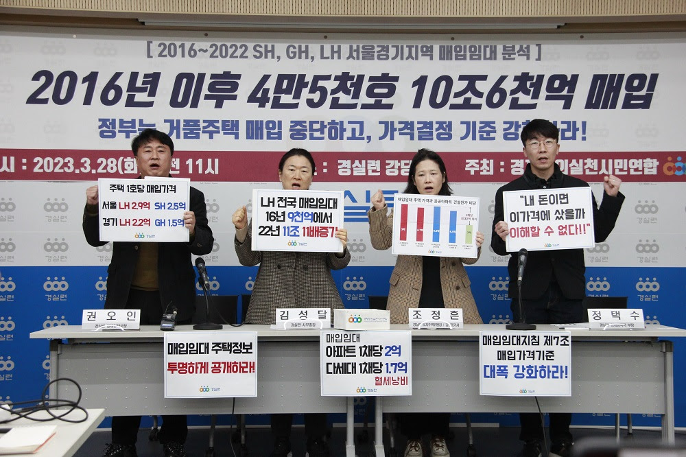 경제정의실천시민연합(경실련)은 28일 오전 서울 종로구의 경실련 회관에서 기자회견을 열고 ‘LH·SH·GH 서울·경기 지역 매입임대 분석결과’를 발표했다. [사진제공=경제정의실천시민연합]