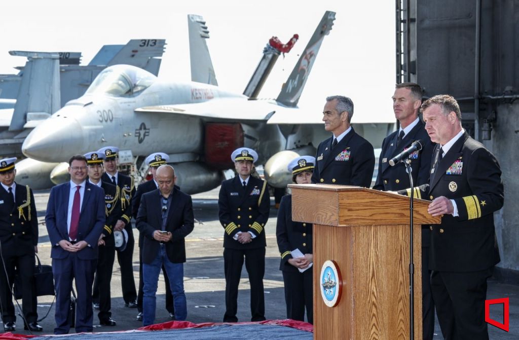 28일 부산 작전기지에 입항한 미국 핵 추진 항공모함 니미츠(CVN-68) 갑판에서 열린 한미 기자회견에 미 제11항모강습단 크리스토퍼 스위니 단장이 발언하고 있다. 사진=사진공동취재단