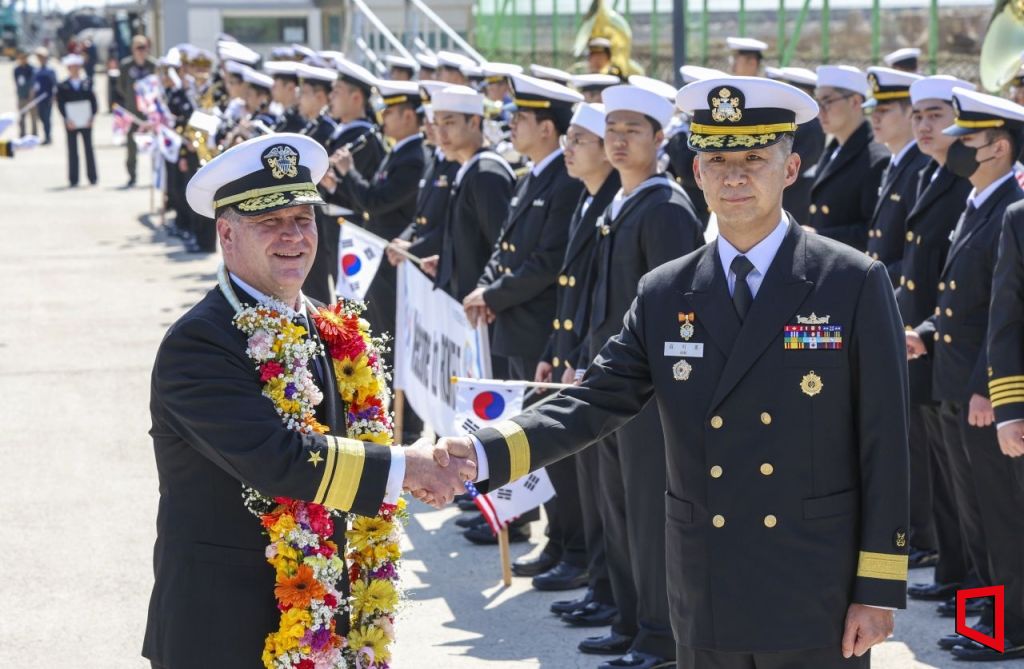 28일 부산 작전기지에 미국 핵 추진 항공모함 니미츠(CVN-68)가 입항해 미 제11항모강습단 크리스토퍼 스위니 단장과 해군작전사령부 김지훈 해양작전본부장이 악수를 나누고 있다. 사진=사진공동취재단