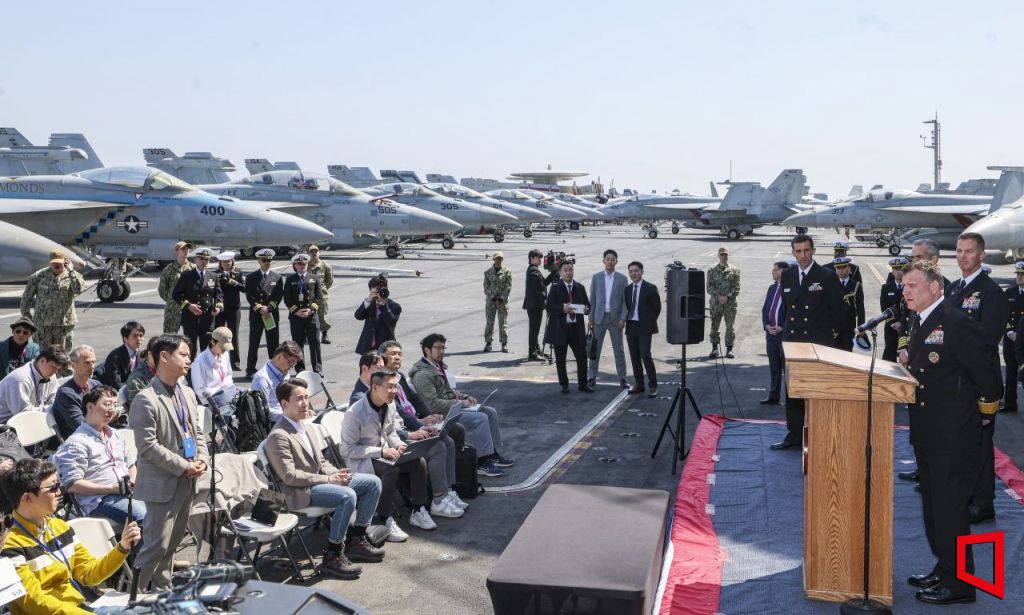 28일 부산 작전기지에 입항한 미국 핵 추진 항공모함 니미츠(CVN-68) 갑판에서 열린 한미 기자회견에 미 제11항모강습단 크리스토퍼 스위니 단장이 발언하고 있다. 사진=사진공동취재단