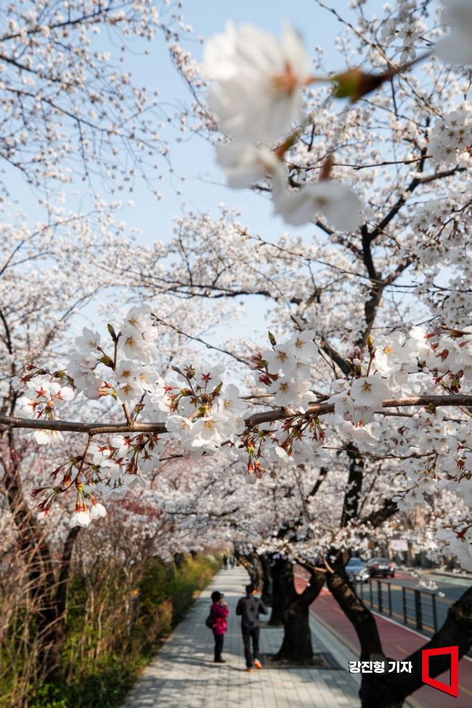 전국 벚꽃 개화가 예년보다 빨라진 29일 서울 여의도 윤중로에 벚꽃이 꽃망울을 터트리고 있다.