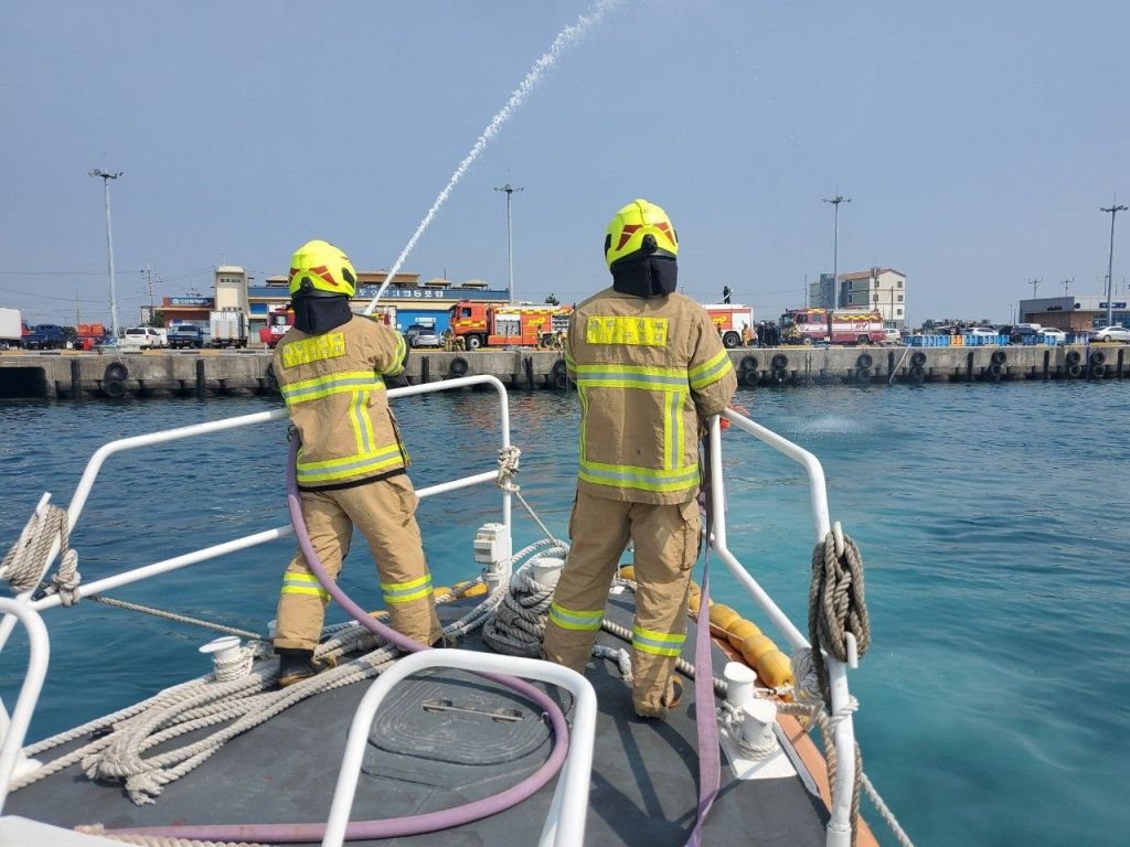 제주서부소방서가 지난 28일 대정읍 모슬포항 일대에서 유관기관 합동 선박화재 대응능력 강화 훈련을 실시했다.[사진제공=제주서부소방]