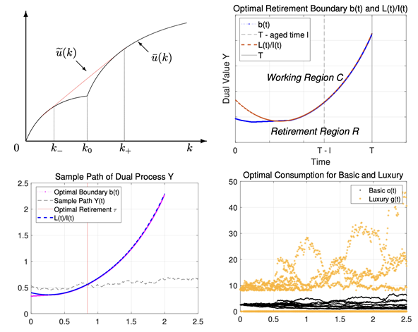 비동조적 소비의 효용함수(왼쪽 위), 최적 은퇴시기 계산을 위한 도메인 구축(오른쪽 위), 최적 은퇴시기 시뮬레이션(왼쪽 아래), 기본상품사치상품의 최적소비 및 비소비 영역 시뮬레이션(오른쪽 아래) 연구 그림.