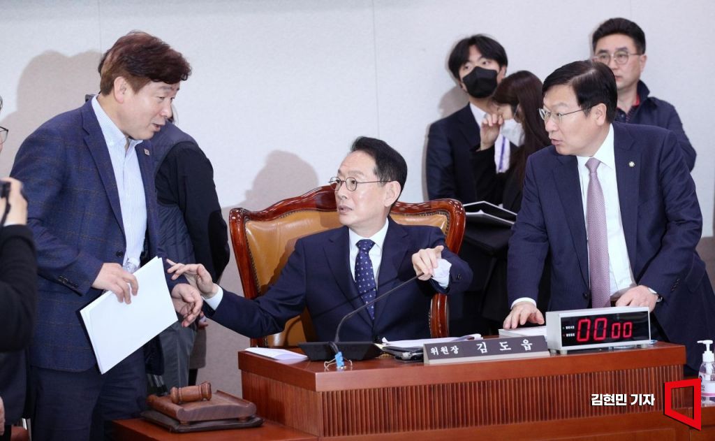 김도읍 국회 법사위원장과 양당 간사들이 29일 서울 여의도 국회에서 열린 정정미 헌법재판관 후보자에 대한 인사청문회에서 대화하고 있다. 왼쪽부터 기동민 야당 간사, 김 위원장, 정점식 여당 간사. 사진=김현민 기자 kimhyun81@