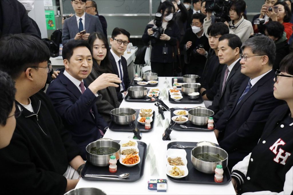 28일 서울 동대문구 경희대학교에서 1천원 아침밥을 먹으며 청년들과 대화하는 김기현 국민의힘 당대표. [이미지출처=연합뉴스]