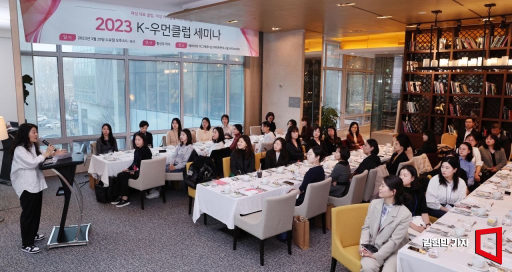황선우 작가가 29일 서울 여의도 메리어트 이그제큐티브 아파트먼트에서 아시아경제 주최로 열린 '2023 K-우먼클럽 세미나'에서 '직장 내 인간관계, 조직에서 나 드러내기'를 주제로 강연하고 있다. 사진=김현민 기자 kimhyun81@