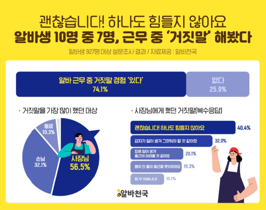 아르바이트 구직자가 대다수가 알바 구직 혹은 근무 중에 거짓말을 한 경험이 있다고 밝혔다. 채용 공고문에서 믿지 않는 문구 1위로는 '가족같이 편한 분위기'가 꼽혔다.