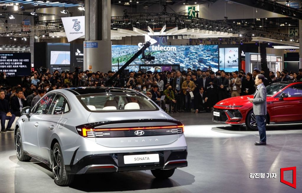 30일 경기 고양 킨텍스에서 열린 '2023서울모빌리티쇼 프레스브리핑'에서 현대자동차 '소나타 디 엣지'가 공개되고 있다.