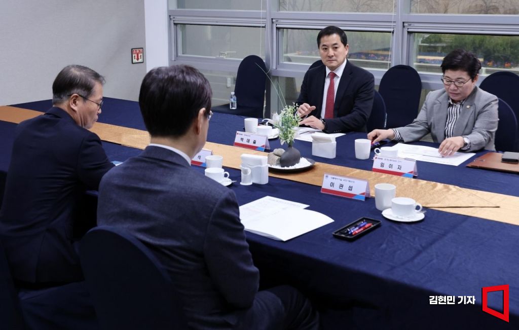 31일 서울 여의도 국회에서 근로시간 개편안 관련 비공개 당정대 조찬간담회가 열리고 있다. 이번 간담회에는 박대출 국민의힘 정책위의장과 국회 환경노동위원회 여당 간사 임이자 의원이 참석했고, 이정식 고용노동부 장관과 이관섭 대통령실 국정기획수석이 참석했다. 사진=김현민 기자 kimhyun81@