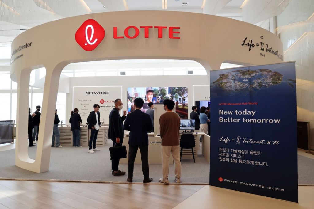 롯데지주는 약 165㎡(약 50평) 규모 전시관에서 지난 1월 미국 라스베이거스에서 열린 세계 최대 전자·IT 전시회 CES 2023 부스에서 소개한 주요 내용을 축약해 선보였다. 전시관 왼쪽에 마련한 가상현실(VR) 기기를 통해 현재 개발 중인 '롯데 메타버스(가칭)'를 소개했다. 올 연말 출시를 앞둔 롯데 메타버스는 게임, 커뮤니티 위주인 기존 메타버스를 넘어 쇼핑, 공연 관람 등도 가능하도록 그룹 연계 플랫폼으로 설계했다. 오프라인, 온라인을 넘어 초실감형으로 롯데의 상품과 서비스를 접할 수 있도록 해 미래 세대 충성 고객을 선점한다는 전략이다. 이날 전시관에선 VR 기기뿐 아니라 대형 화면과 PC 등을 통해서도 롯데 메타버스를 체험할 수 있도록 했다.