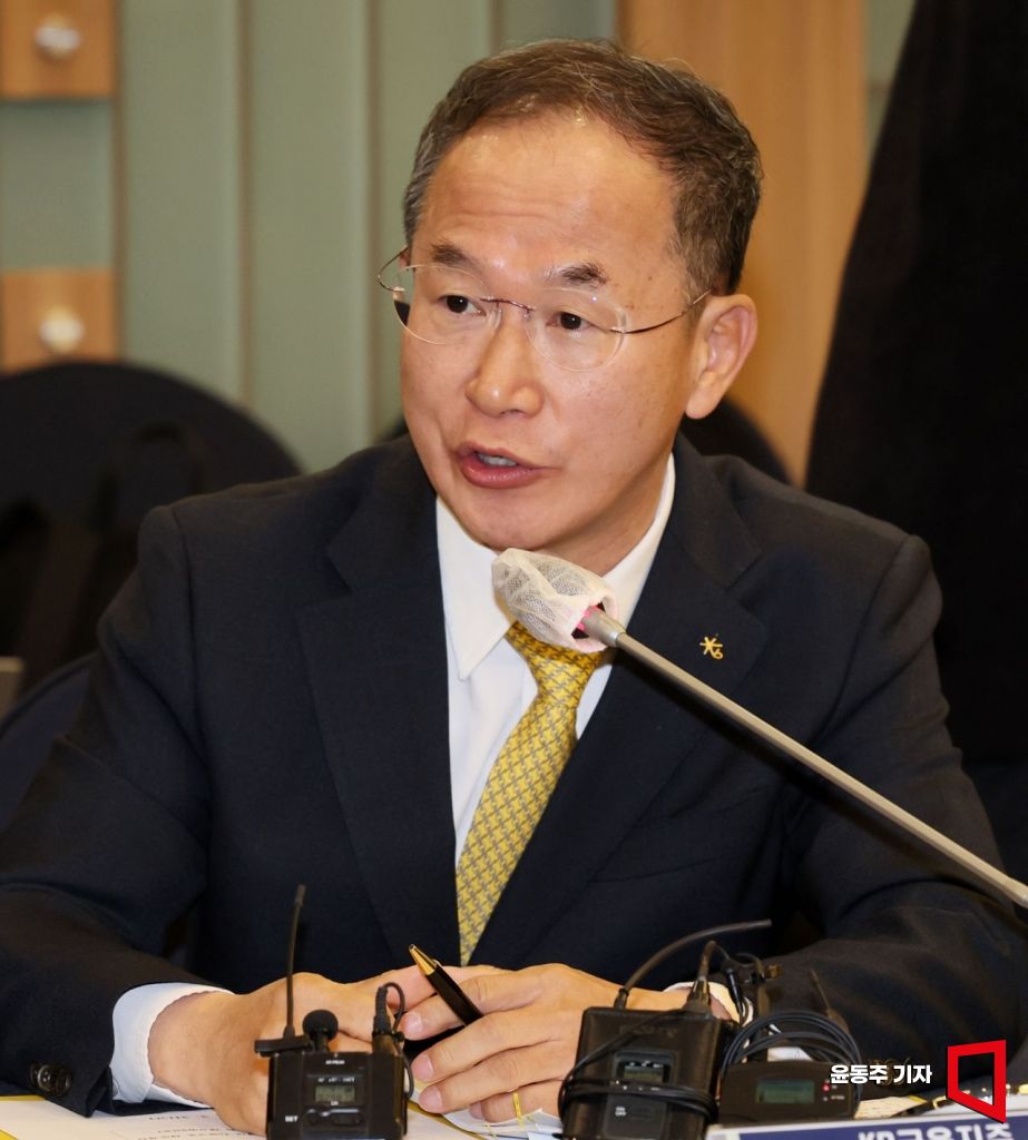양종희 KB금융지주 부회장이 31일 서울 중구 프레스센터에서 열린 금융지주회장 간담회에 참석, 발언을 하고 있다. 이번 간담회는 김주현 금융위원장과 이복현 금융감독원장, 진옥동 신한금융지주 회장, 임종룡 우리금융지주 회장, 함영주 하나금융지주 회장, 이석준 NH농협금융지주 회장, 양종희 KB금융지주 부회장, 김광수 은행연합회장이 참석했다. 사진=윤동주 기자 doso7@
