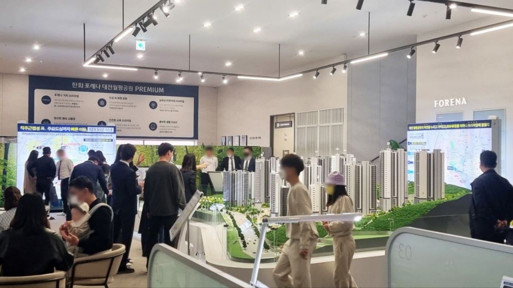 [예비 계약자들이 ‘포레나 대전월평공원’ 견본주택을 둘러보는 모습]