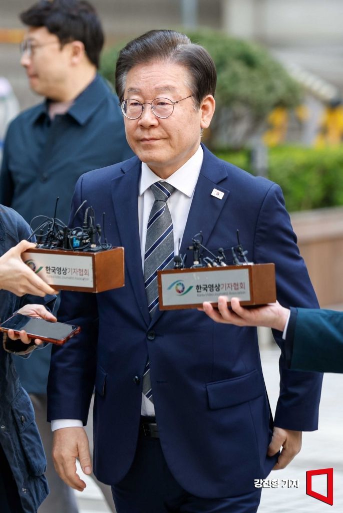 공직선거법상 허위사실 공표 혐의를 받고 있는 이재명 더불어민주당 대표가 31일 서울 서초구 서울중앙지방법원에서 열린 공판에 출석하고 있다.