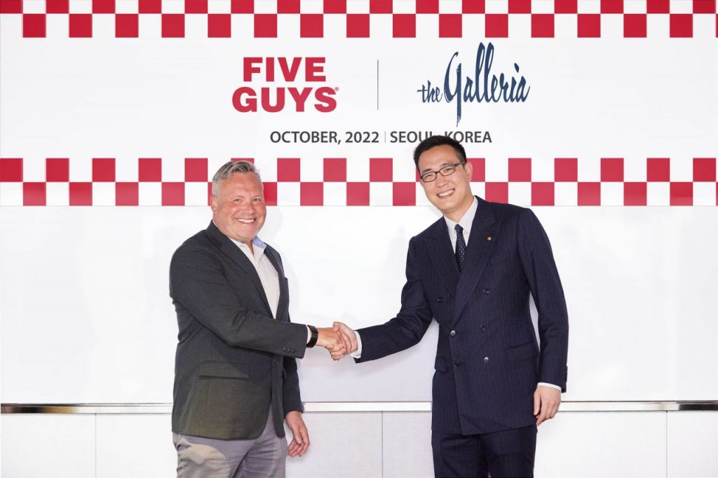 김동선 한화갤러리아 전략본부장(오른쪽)과 윌리엄 피처 파이브가이즈 인터내셔널 총괄 부사장이 지난해 10월 서울 더플라자에서 파이브가이즈 국내 사업 추진을 위한 약정 체결 후 기념촬영을 하고 있다[사진제공=한화갤러리아].