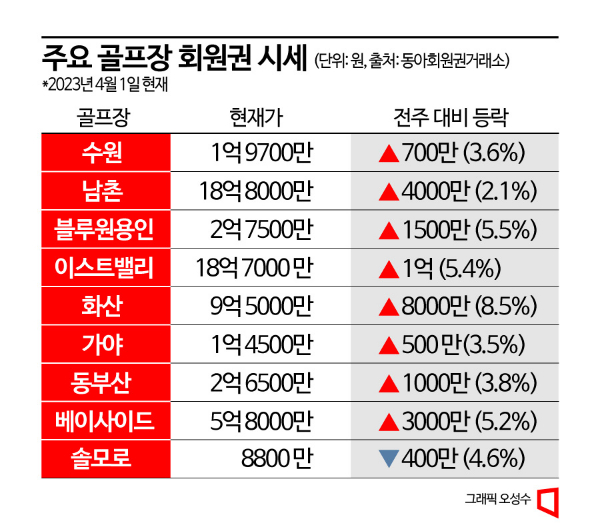 이윤희 동아회원권거래소 남부권 팀장은 "시즌을 맞아 법인 무기명 회원권 문의가 증가하고 있으며 인기 종목의 회원권 매물은 품귀현상을 나타내고 있다"면서 "남부권 회원권 시장은 강보합세장을 이어갈 것으로 예상한다"고 분석했다.
