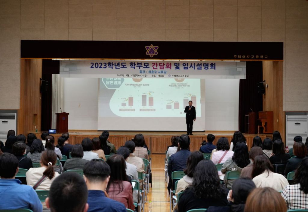 하윤수 부산시 교육감이 지난 30일 오후 7시 10분 사상구 주례여자고등학교에서 열린 ‘학교에서 만나요!’ 행사에서 특강을 진행했다.