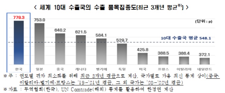 한경연이 한국무역협회와 유엔(UN)의 국제무역 통계를 활용해 주요 국가들의 수출 품목 집중도(UN의 SITC 2단위 분류 기준)를 계산한 결과 한국은 779.3포인트로 세계 10대 수출국(평균 548.1포인트) 중 가장 높았다. 한국 다음으로는 일본(753.0포인트), 중국(640.2포인트), 캐나다(621.5포인트), 벨기에(584.1포인트), 독일(529.7포인트) 순으로 수출 품목 집중도가 높았다. 10대 수출국 중 품목 집중도가 가장 낮은 나라는 네덜란드(372.1포인트)다. 한국의 절반 수준에 불과했다.