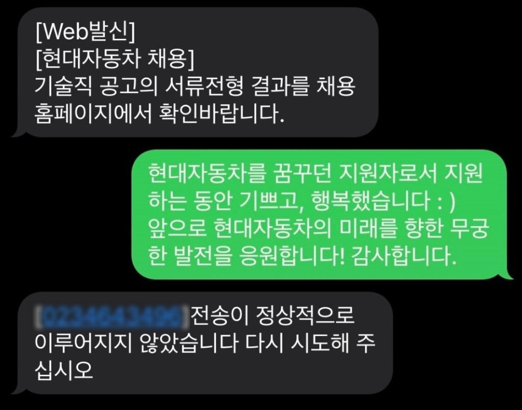 A씨는 채용 홈페이지를 확인한 뒤 자신이 서류전형에서 탈락했다는 사실을 알았다. 이후 그는 "현대자동차를 꿈꾸던 지원자로서 지원하는 동안 기쁘고 행복했다"라며 "앞으로 현대자동차의 미래를 향한 무궁한 발전을 응원한다. 감사합니다"라고 메시지를 보냈다.