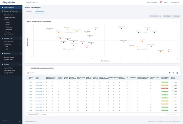 Playce RoRo는 서비스별로 기술적 관점과 업무적 관점에 따라 클라우드 전환에 대한 적합도를 판단, 이를 통해 워크로드별 클라우드 전환 용이성과 전환 리스크를 확인할 수 있다.