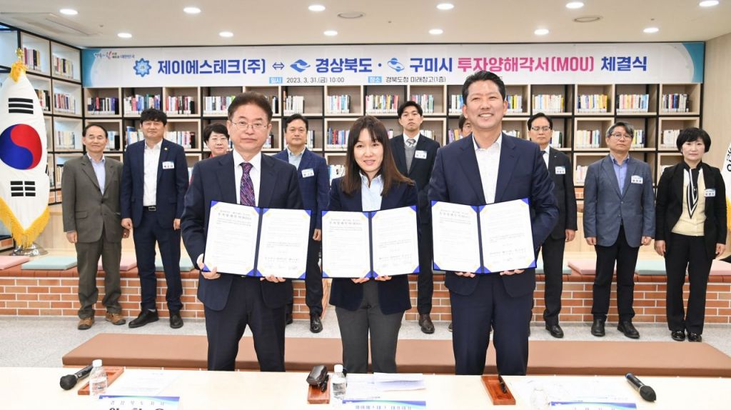 구미시(시장 김장호)는 31일 경북도청 미래창고에서 이철우 경북도지사, 김장호 구미시장, 제이에스테크㈜ 김민강 대표 등 20여명이 참석한 가운데 구미하이테크밸리 투자 MOU 체결을 진행했다고 알렸다.