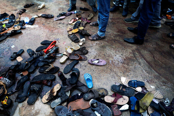 압사 사고가 발생한 파키스탄 카라치의 구호품 배급소 앞에 놓인 주인 없는 신발들 [이미지출처=연합뉴스]