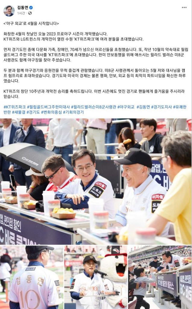 김 지사는 이날 자신의 사회관계망 서비스(SNS)에 올린 '야구 외교로 4월을 시작합니다'라는 글을 통해 "화창한 4월의 첫날인 오늘 2023 프로야구 시즌이 개막했다"며 "KT위즈와 LG트윈스의 개막전이 열린 수원 'KT위즈파크'에 여러 분들을 초대했다"고 전했다.