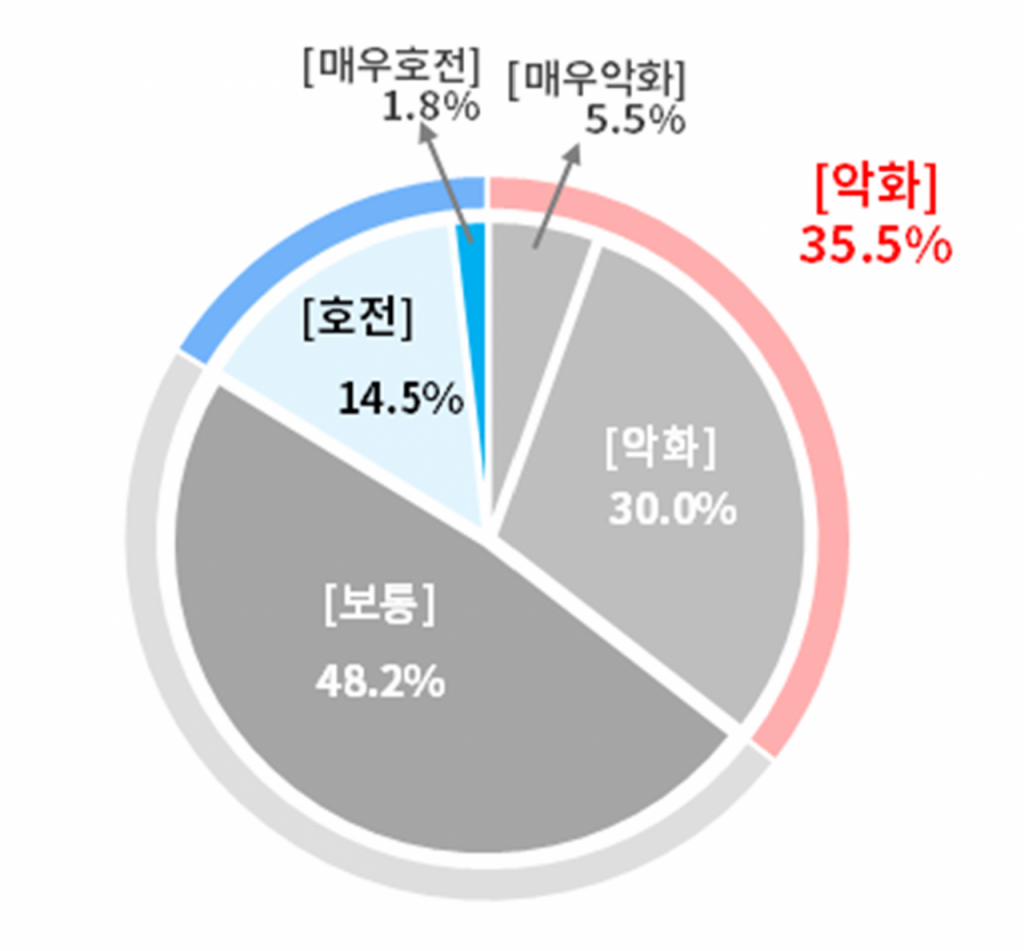 ‘작년 대비 전반적 자금 사정(내부 유보금 등)’에 대해서도 ‘악화했다’(35.5%)는 기업이 ‘호전됐다’(16.3%)는 기업보다 2배 이상 많았다.