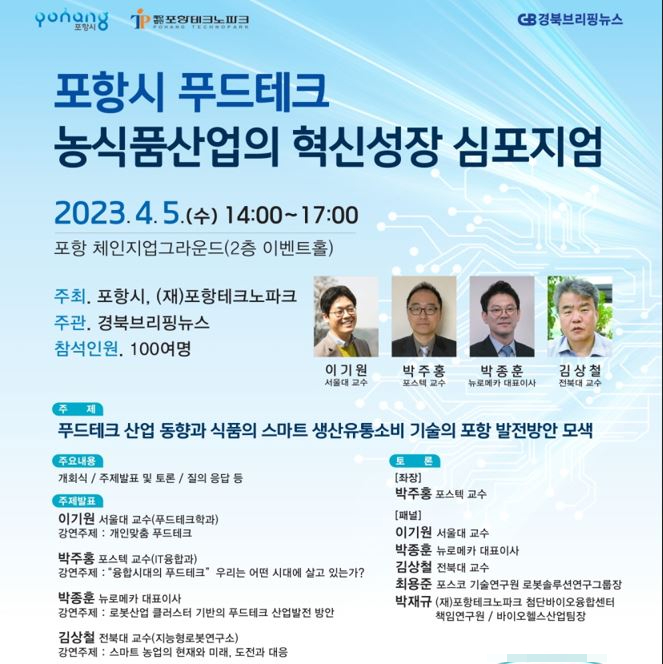 시는 오는 4월 5일 오후 2시부터 포항 체인지업그라운드 2층 이벤트홀(포스텍 내)에서 포항테크노파크와 공동으로 ‘포항시 푸드테크 농식품산업 혁신성장 심포지엄’을 개최한다.