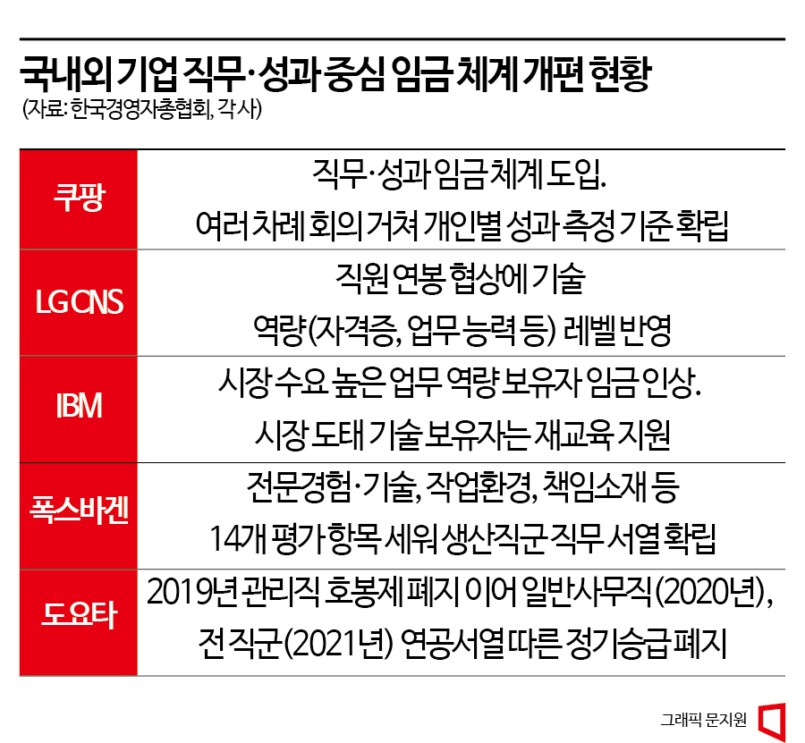 재계는 직무·성과 중심의 임금체계 도입을 늘리는 추세다. 국내 기업들이 추진해 온 직급단계 간소화, 승진 연한 폐지 등은 성과 중심 문화를 다지는 초석이다. 글로벌 기업 사이에서 직무급제는 이미 글로벌 스탠더드로 자리 잡았다. 직무별로 임금에 차등을 두되 해당 직무에서 기량이 뛰어난 직원에게 보상을 늘리는 방식이다.