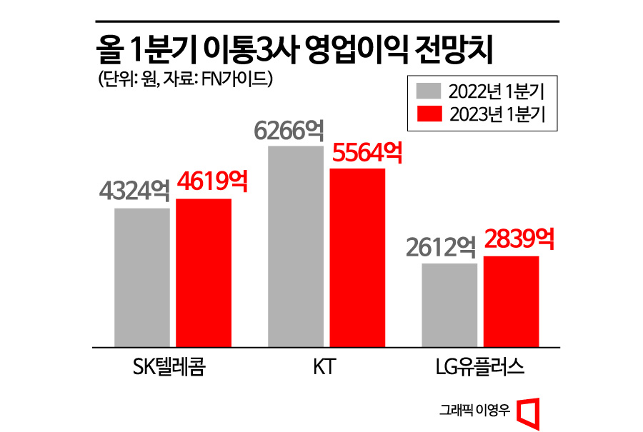 이동 통신 3사의 올 1분기 합산 영업이익이 1조원을 무난히 돌파할 것으로 전망된다. 다만 지난해 같은 기간보다는 이익이 소폭 감소할 것으로 예상됐다. SK텔레콤과 LG유플러스의 실적 성장세가 이어졌지만, 대내외적인 환경 변화로 KT의 이익이 줄었기 때문이다.