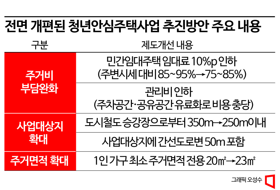 이번 방안에는 임대료와 관리비를 인하하는 내용이 담겼다. 기존 역세권청년주택 중 민간임대 유형 임대료는 주변 시세 대비 85~95% 수준으로 공급됐지만, 개편을 통해 10%포인트 낮춘 75~85% 선에서 공급한다. 시세 공표 이후에 의견을 수렴하는 ‘청년주택 운영자문위원회’ 심사도 거칠 예정이다.