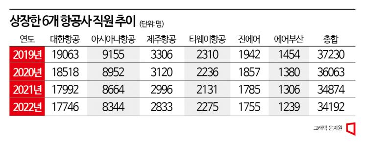 항공사 직원들은 2019년을 기점으로 계속해서 감소했다. 코로나19가 본격적으로 발발한 2020년에는 3만6063명, 2021년 3만4874명이었다. 이 중 가장 많은 직원이 회사를 떠났던 시기는 2021년이었다. 총 1186명이 감소했다. 이어 2020년 1167명, 2022년 682명 등의 순이었다.