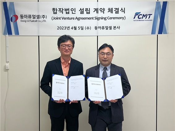 이번 체결식은 지난 5일 경기도 성남시 동아퓨얼셀 본사에서 이성근 동아퓨얼셀 대표이사와 이정규 FCMT 대표이사 등 관계자들이 참석한 가운데 진행됐다.