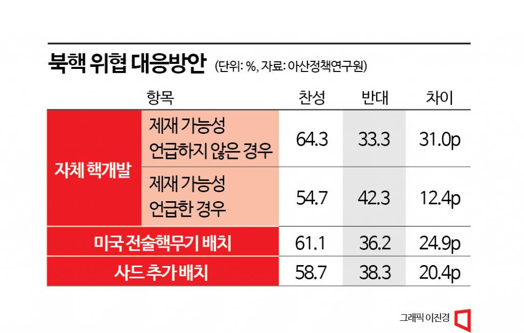 별도 문항에서 '국제사회 제재 가능성'을 언급하고 다시 의견을 물었을 땐 응답자 54.7%가 찬성하고 42.3%가 반대했다. 제재 가능성을 언급하지 않은 경우와 비교할 때 찬성은 약 10%p 줄어들고, 반대 의견이 비슷한 수준으로 늘었지만, 여전히 국민 절반 이상은 자체 핵개발에 찬성한 것이다.