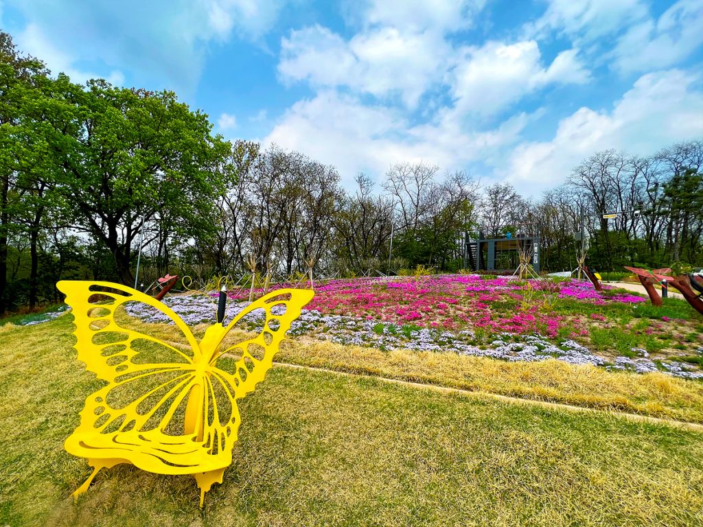 현재는 보라색· 분홍색의 꽃잔디가 산책로 주변을 수놓았고 배나무에서는 하얀 배꽃이 만개해 상춘객을 기다리고 있다.