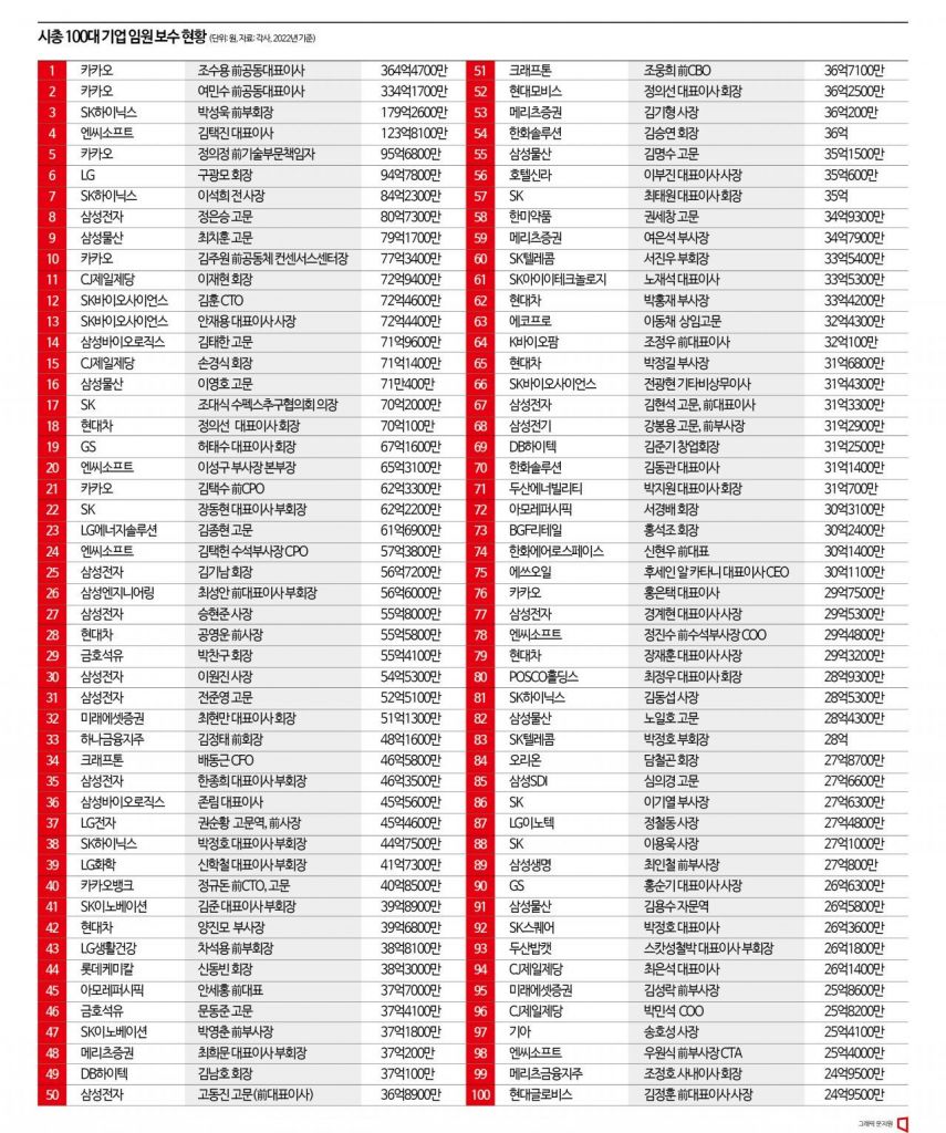 시가총액 100대 기업 임원 보수 현황