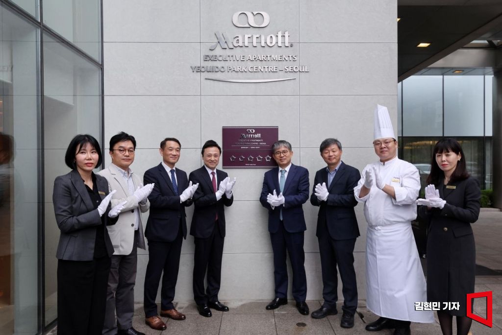 메리어트 인터내셔널의 국내 유일한 럭셔리 레지던스 호텔인 메리어트 이그제큐티브 아파트먼트 서울은 11일 호텔 등급 5성 획득을 기념한 현판식을 진행했다. 김복례 호텔 부총지배인(왼쪽부터), 에이비디에셋 강윤구 대표, 키스톤 PE/아시아 경제 마영민 대표, 이민영 호텔 총괄 총지배인, 키스톤 PE/아시아경제 현상순 회장, 아시아경제 우병현 대표, 김덕행 총주방장, 김민재 객실 팀장이 현판식을 하고 있다. 사진=김현민 기자 kimhyun81@