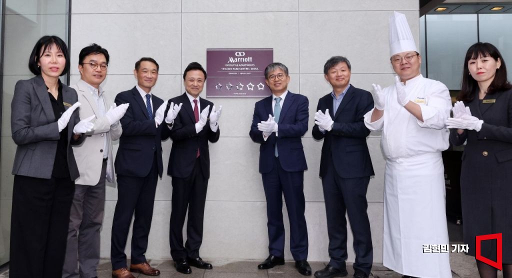 메리어트 인터내셔널의 국내 유일한 럭셔리 레지던스 호텔인 메리어트 이그제큐티브 아파트먼트 서울은 11일 호텔 등급 5성 획득을 기념한 현판식을 진행했다. 김복례 호텔 부총지배인(왼쪽부터), 에이비디에셋 강윤구 대표, 키스톤 PE/아시아 경제 마영민 대표, 이민영 호텔 총괄 총지배인, 키스톤 PE/아시아경제 현상순 회장, 아시아경제 우병현 대표, 김덕행 총주방장, 김민재 객실 팀장이 현판식을 하고 있다. 사진=김현민 기자 kimhyun81@