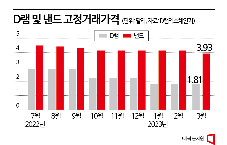 낸드 가격은 지난해 6월부터 계속 떨어지고 있습니다. 글로벌 경기가 나쁘다 보니 수요가 줄었고, 공급이 넘치면서 재고가 과도하게 쌓인 탓입니다. 시장조사업체 D램 익스체인지 통계를 보면, 지난달 메모리카드와 USB에 쓰이는 낸드(128Gb 16Gx8) 고정거래가격(기업 간 계약 거래 금액)은 전월보다 5.12% 떨어진 3.93달러였습니다.