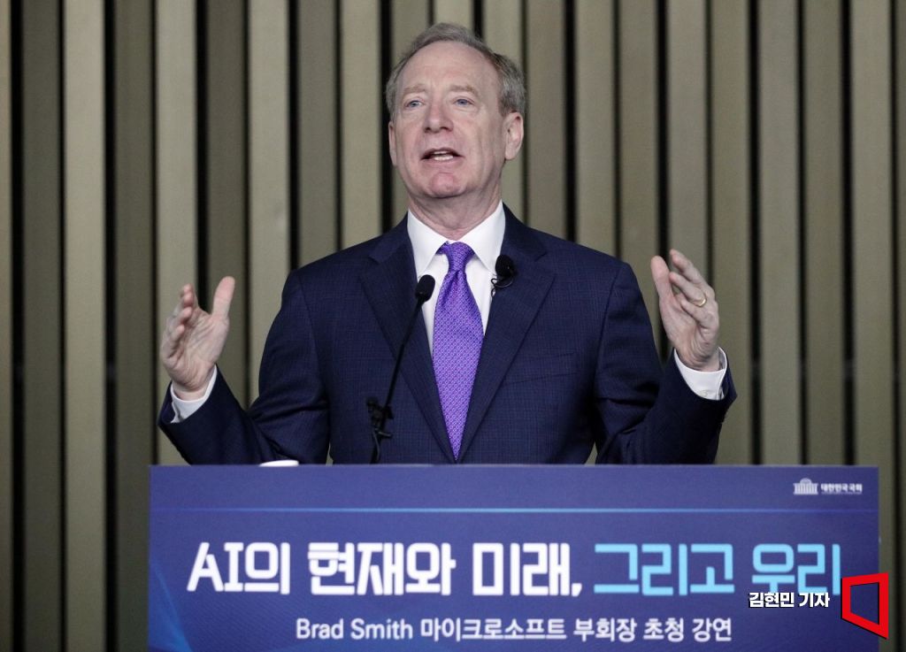 브래드 스미스 마이크로소프트 부회장이 18일 서울 여의도 국회에서 'AI의 현재와 미래, 그리고 우리'를 주재로 강연하고 있다. 사진=김현민 기자 kimhyun81@