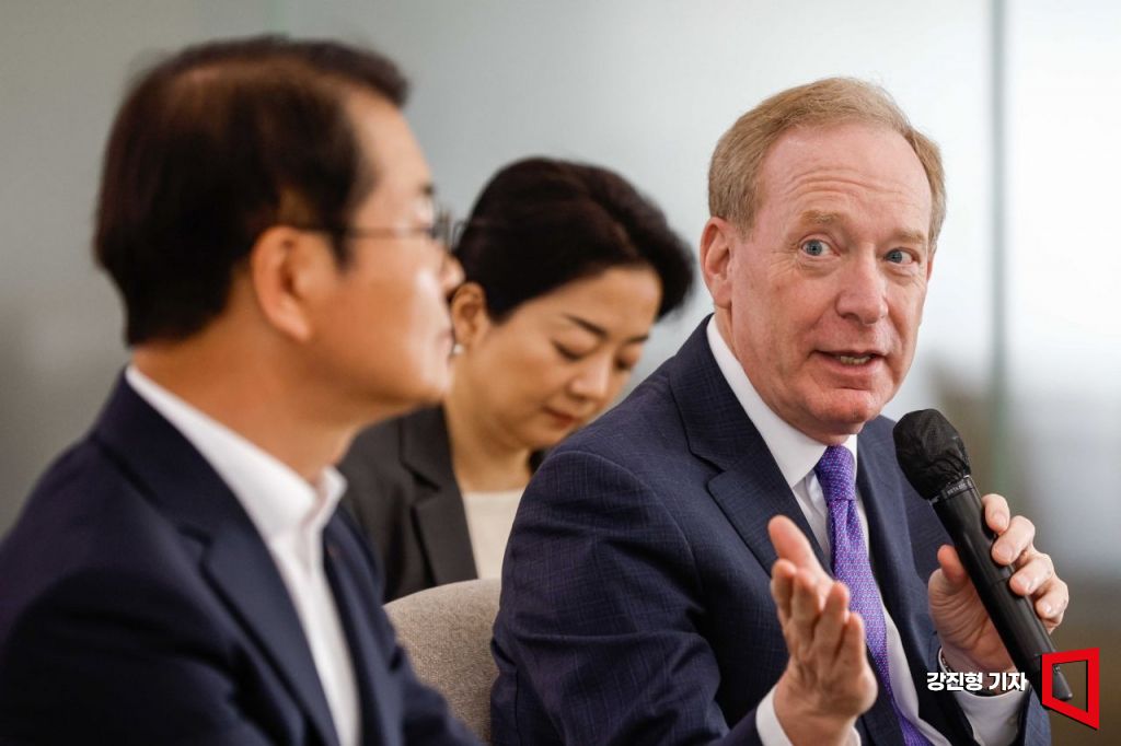 브래드 스미스 마이크로소프트 부회장 겸 총괄 사장이 18일 서울 용산구 숙명여대에서 열린 '고용노동부-마이크로소프트 청년 간담회'에 참석해 인사말 하고 있다.