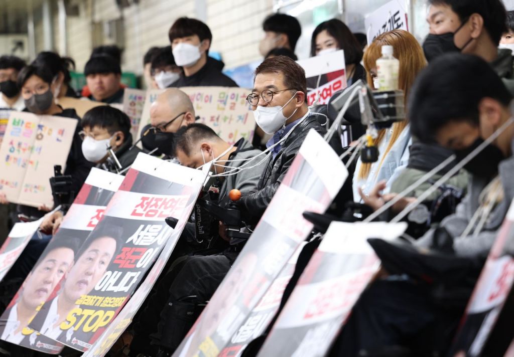 장애인의 날을 하루 앞둔 19일 오전 전국장애인차별철폐연대(전장연) 관계자들이 서울 종로구 지하철 4호선 혜화역 승강장에서 장애인 권리 예산을 촉구하는 선전전을 펼치고 있다. [이미지출처=연합뉴스]