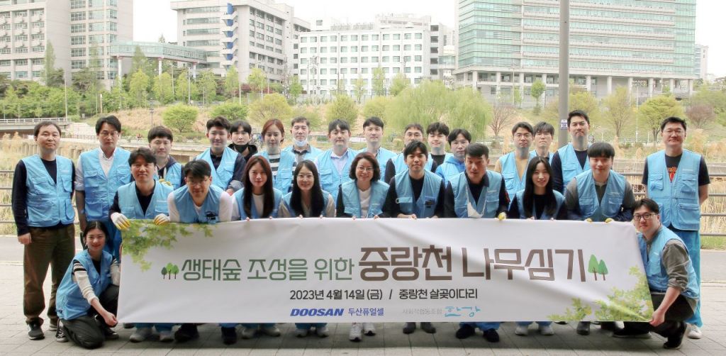 지난 14일 서울 성동구 살곶이공원에서 두산퓨얼셀 임직원들이 관목을 식재하고 있다. [사진제공=두산퓨얼셀]