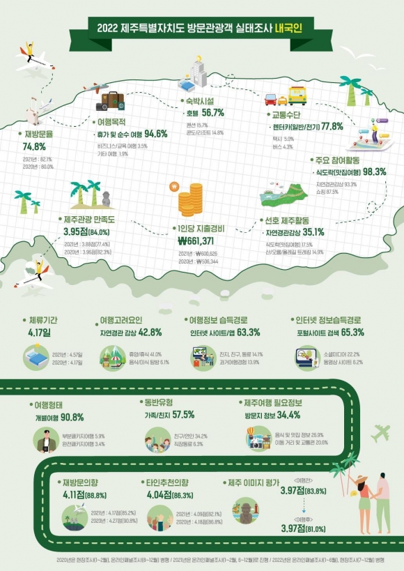 제주관광공사는 20일 2022년 한 해 동안 제주를 방문한 관광객의 여행 행태와 소비실태, 제주 여행에 대한 평가 등을 조사한 '2022년 제주특별자치도 방문관광객 실태조사'를 발표했다.